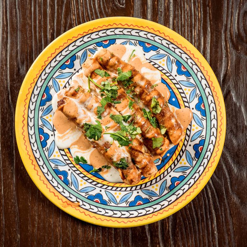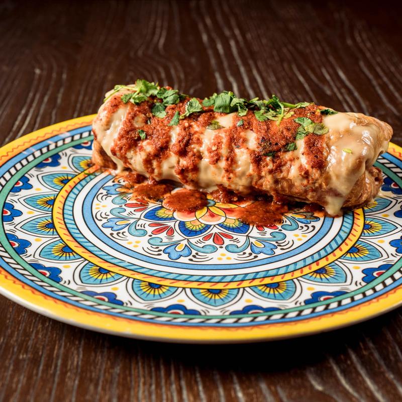 Deep fried burrito with ground beef, queso fresco, and roja salsa with cilantro. Served with a side of rice & refried beans
