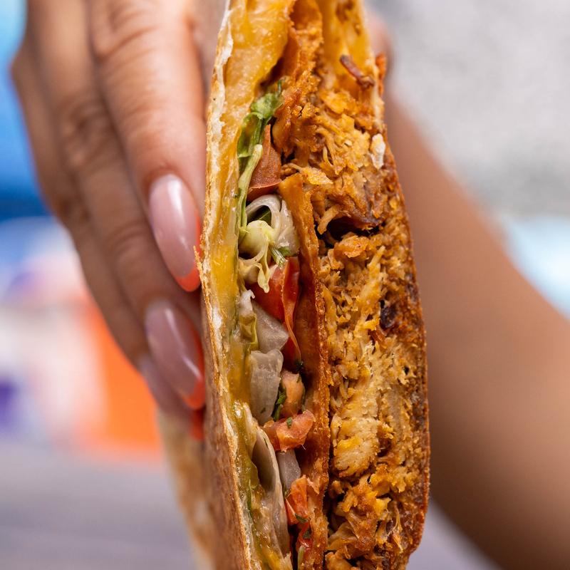 Lettuce, tomato, cheese, crunchy corn shell in a 12″ flour tortilla with beef or chicken • Upgrade to Carne Asada, Carnitas, Chorizo, Pollo Asado, Portobello Mushrooms or Brussels $4