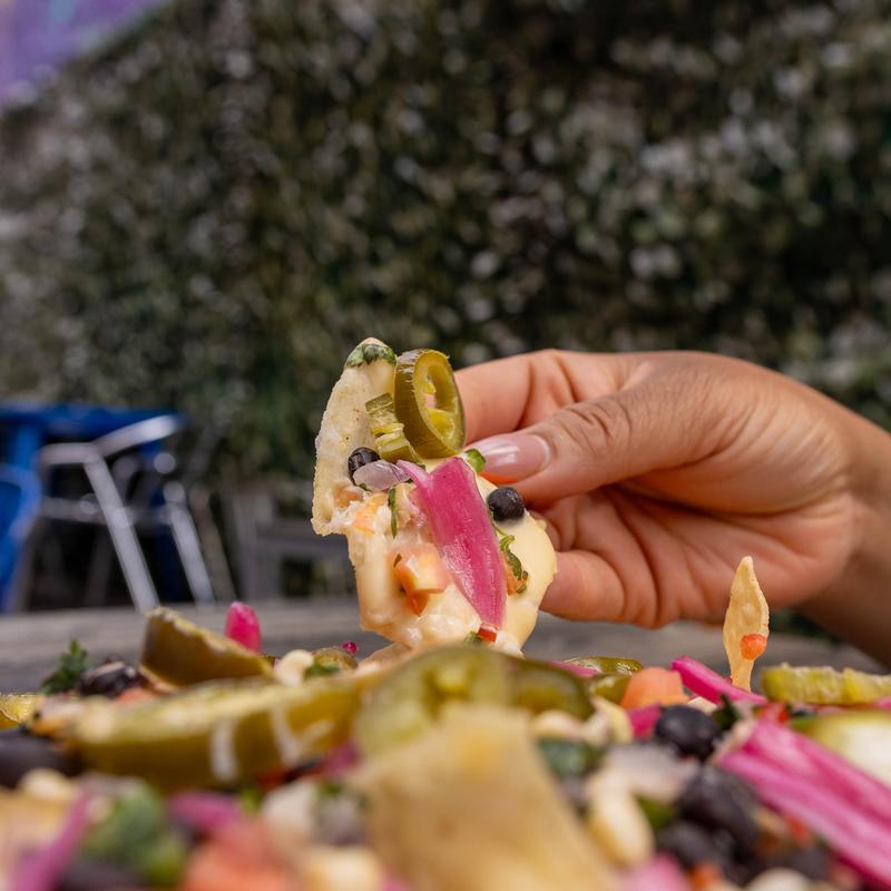 House queso, corn and black bean salsa, pickled jalapeños, pickled onions, pico de gallo, black olives and sour cream • Choice of Carne Asada, Ground Beef, Chicken, Chorizo, Carnitas or Brussels $4